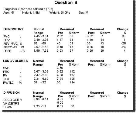 Question A 1. What is the significance of the spirometry results? fall in FEV1 suggests diaphragmatic paresis. 2. What size of change is usually regarded as abnormal? 15% fall in FEV1 3. What confirmatory tests could be performed to establish the diagnosis? US of diaphragm and / or phrenic nerve stimulation 4. What is the prognosis in most cases? generally good with significant return of function in idiopathic or post viral cases over a 3 year period