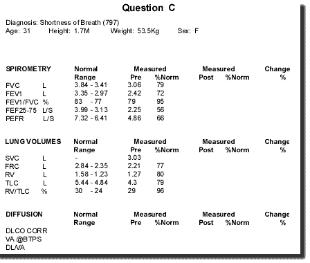 QUESTION C 1. what pattern of abnormality is seen here? restrictive 2. what are the possible causes of this pattern of abnormality? weak muscles / ILD / msk deformity 3. the f/v expiratory curve has a serrated appearance. Of which condition is this said to be characteristic? SAS 4. Why? Variable collapsibility producing oscillation of airway calibre during expiration.
