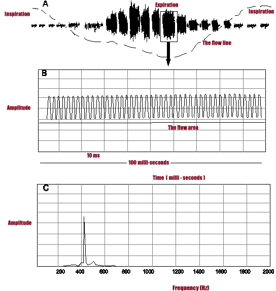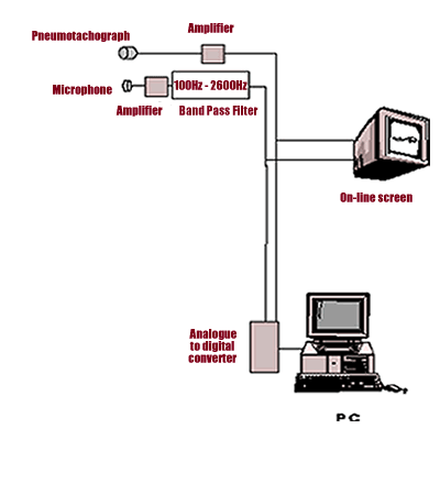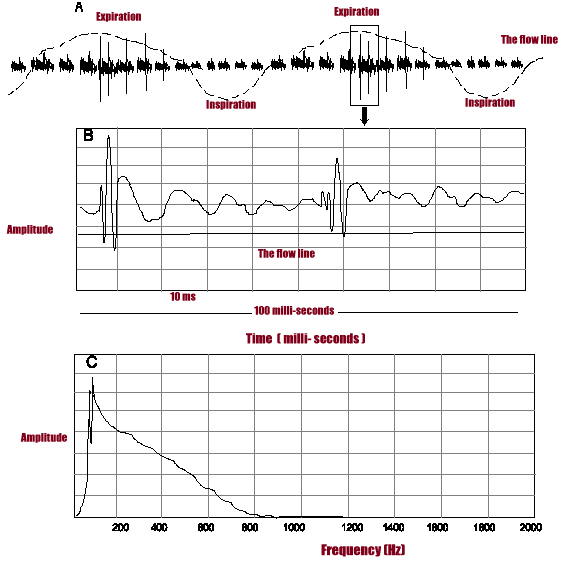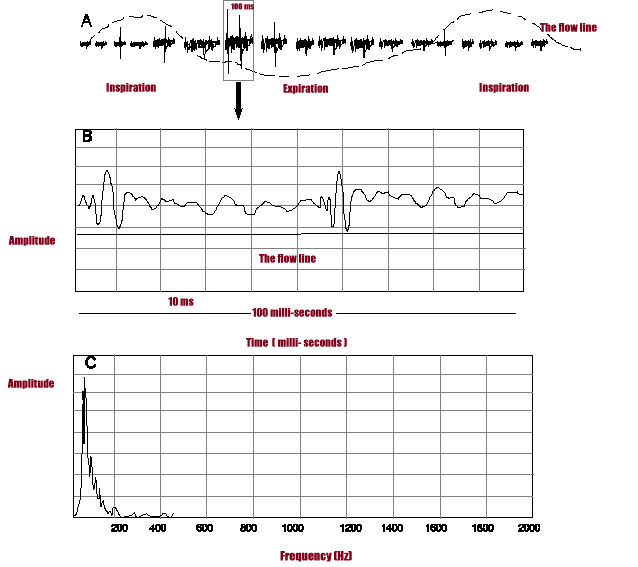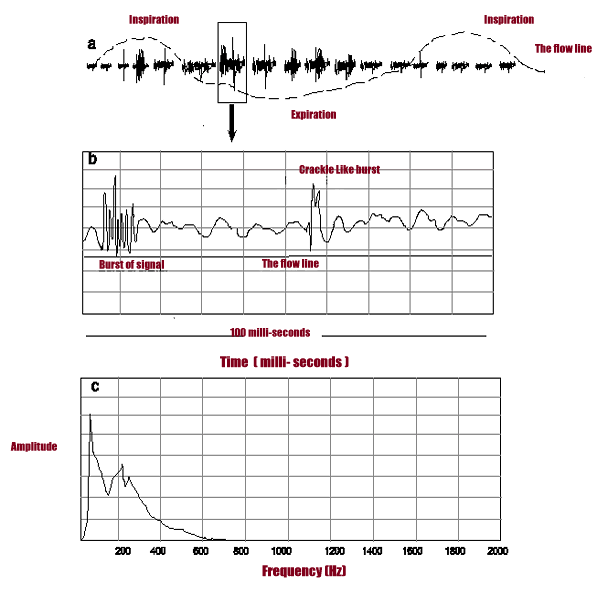 Terminology (nomenclature): Many physicians use different terms to describe the same sounds. Adjectives such as "wet, dry, coarse and fine" were used to describe crackles for example. Lung sound recording analysis: In 1973 microphones attached to the chest wall and linked to a tape recorder and/or an oscilloscope and a screen became available for teaching and for reference use. The initial aim was to determine the presence of lung crackles in asbestos workers. Soon analogue to digital converters were used and the data were processed through computers for analysis. The machine [Figure 1.] consists of a microphone attached to a filter to remove ambient sounds. Some machines would have a pneumotachograph to register the flow. This helps to identify inspiration and expiration in the respiratory cycle. The sound and the flow signal are converted to digital forms using an analogue to digital converter attached personal computer. the processed sounds are normally plotted as time-domain. In other words the chart is a plot of time against the amplitude ( or the intensity ) of the sound ( fig 2.) It is possible to expand the time to show details of a period a short as 1 millisecond. This helps showing crackles in a great detail. One advantage of the conversion of the analogue signal into a digital signal is that it is possible to deduce a frequency domain plot in which the frequency is a plotted against the amplitude. This is extracted using a method called fast Forrier analysis. |