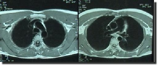 Slide A. axial T1 weighted sequence at D3 level a. brachiocephalic vein becoming SVC b. aortic arch c. trachea