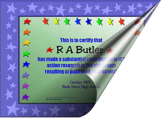 There may be several reasons:Firstly, in a quite elegant use of technology (!), once a contribution is posted by a teacher and their work has been moderated for the world to browse (see "how can I contribute?") the site automatically generates a certifcate of action research (as a pdf) with the teacher-researcher's name displayed centrally and a host of supporting bodies' logos fringing the sheet (where the stars are in the not-final example below). These supporting bodies will include the DfEE and the TES.